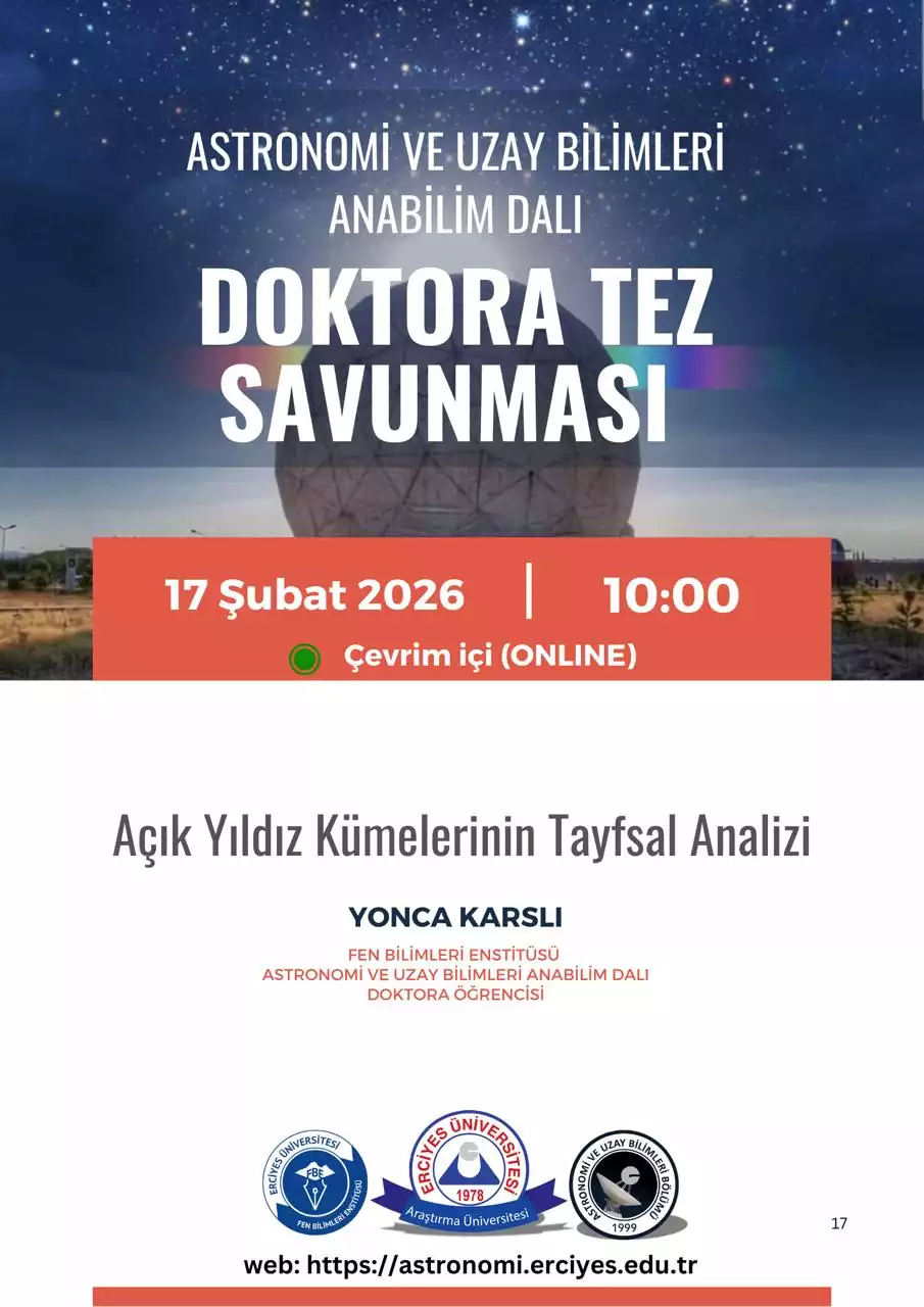 Fen Bilimleri Enstitüsü Astronomi ve Uzay Bilimleri Anabilim Dalı Doktora öğrencisi Yonca KARSLI, "Açık Yıldız Kümelerinin Tayfsal Analizi" başlıklı tezinin tez savunmasını 17 Şubat 2026 Salı günü saat 10.00'da çevrimiçi olarak yapacaktır.